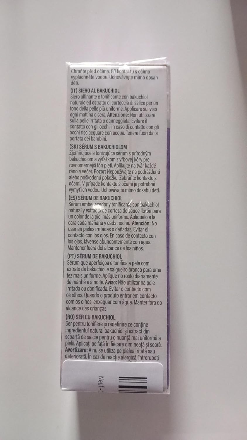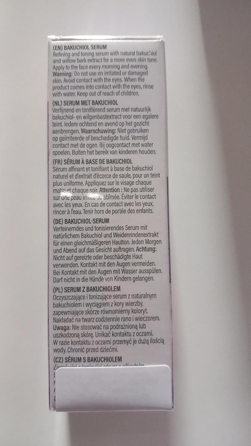 Inhaltsstoffe: Aqua, Glycerin, Salix Nigra Bark Extract (Weidenrindenextrakt), Bakuchiol, Xanthan Gum, Dehydroxanthan Gum, Parfum